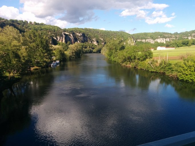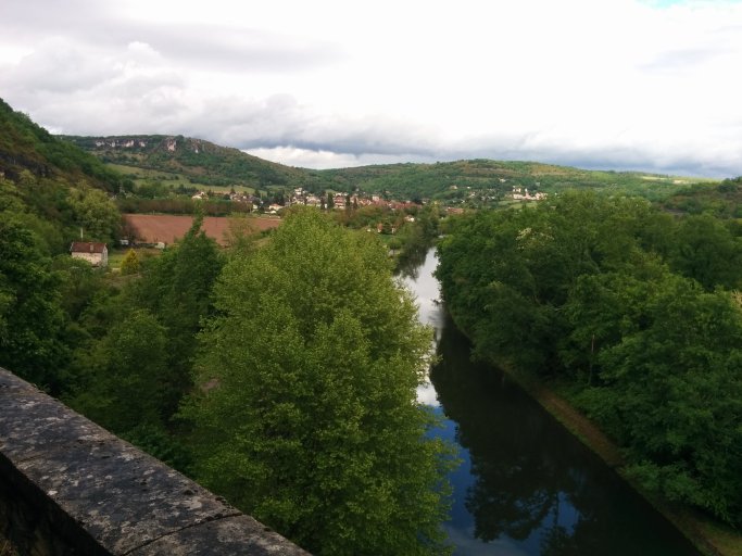 Ich fahre den ganzen Tag entlang des Flusses Lot. Ein sehr malerisches Tal. Photos habe ich kaum gemacht, da ich bei dem Regen das Handy nicht herausholen wollte. Nach zwei Stunden hatte ich so nasskalte Füsse, das ich mir dünne Plastiktüten unter die Socken zog. Das half.